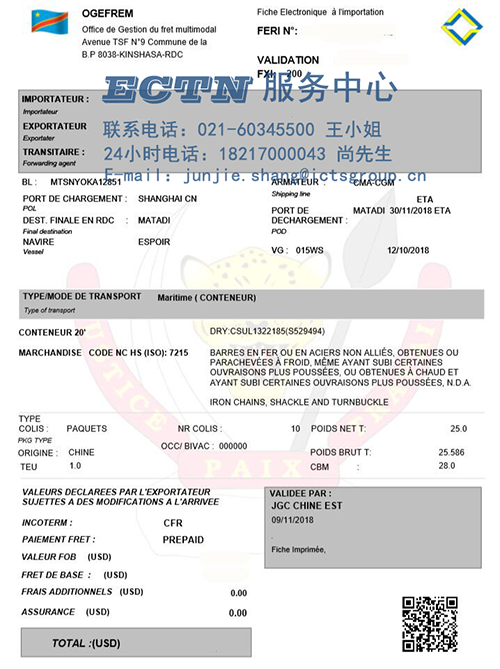 海运在开船之前都会有截单日期,一般海运都会要求刚果金FERI显示在提单上,所以你必须在截单之前生成刚果金FERI,否则海运开船后会要求额外收取改单费。